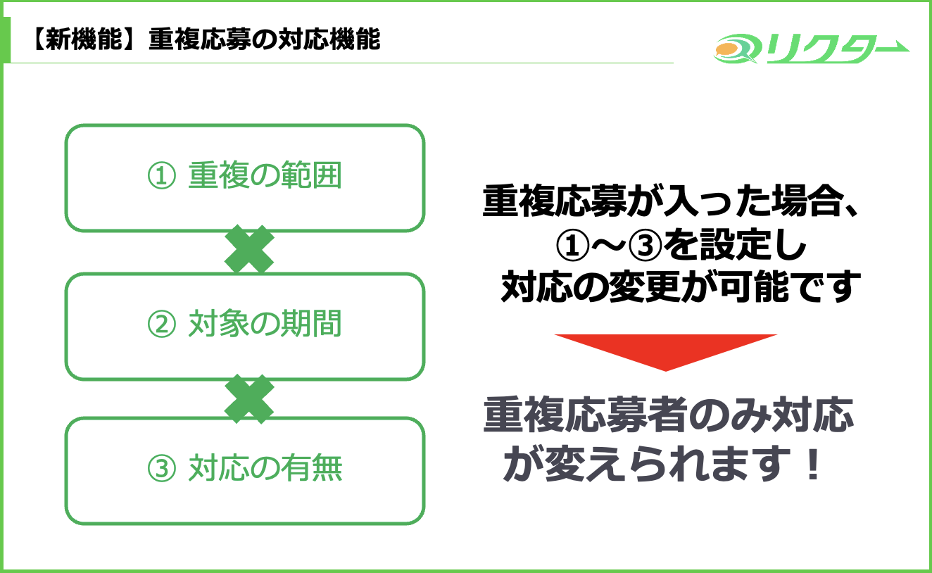 自動で「通常通り対応する」か、「重複応募の対応をする」か、